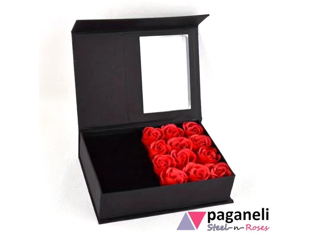Luxusní dárková krabička s magnetickým uzavíráním, sametovým interiérem a 12 dekorativními růžemi. Ideální pro nezapomenutelné předání šperku.