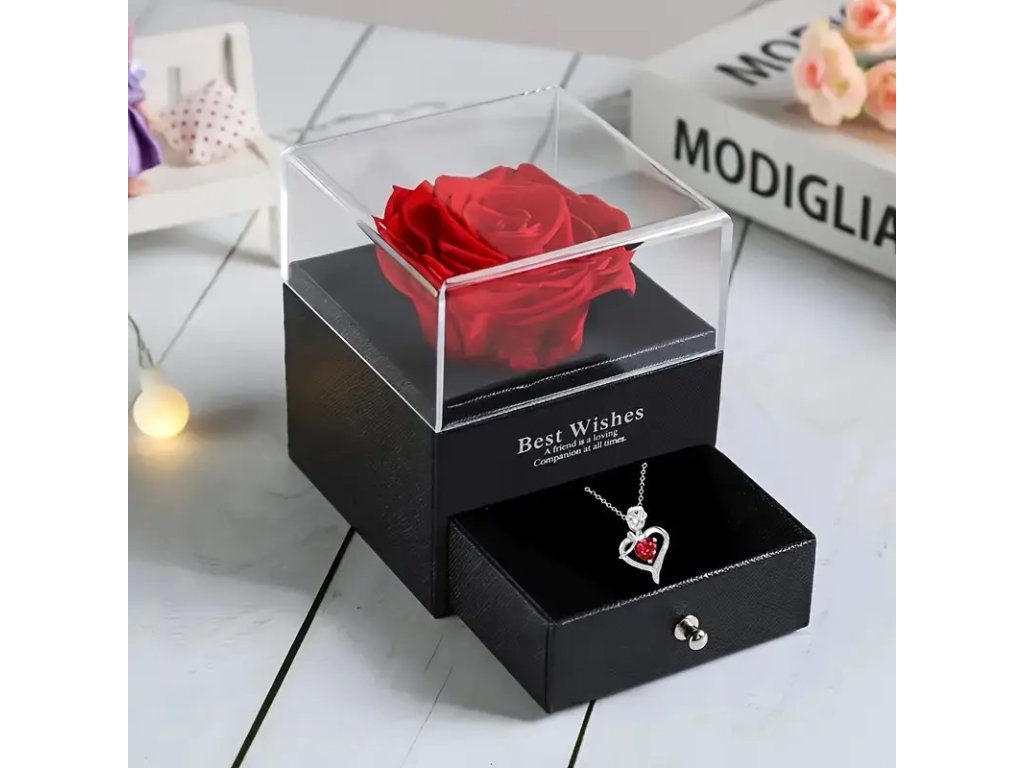 Luxusní krabička s průhledným víkem ukrývá realistickou věčnou růži, která si zachovává svůj vzhled po dlouhé roky. Ve spodní zásuvce je náhrdelník uložen na sametovém podkladu a připraven k okamžitému darování.